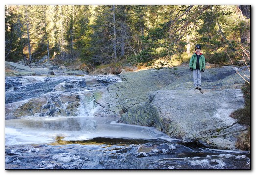 På denne høyden så er det frost til langt på dag, sola får ikke ordentelig tak når den ligger så lavt. Sindre syns det var fasinerende med store istapper så tidlig på året.