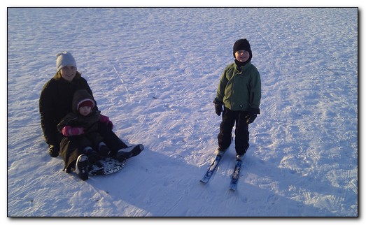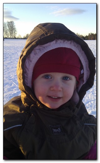 Emeli var ikke fornøyd med å ake på akebrett, hun skulle stå på ski hun også. Litt vanskelig da vi ikke har ski til henne.