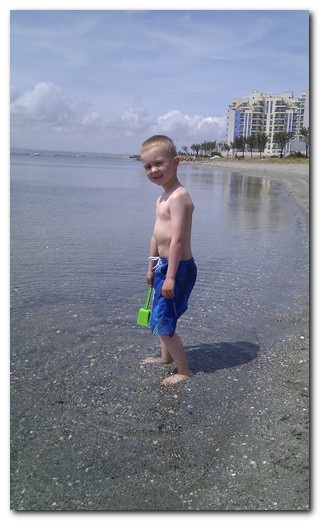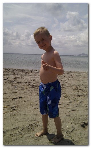 På mandagen var været blitt bra og det ble årets første tur til stranda. Sindre var fornøyd med det.