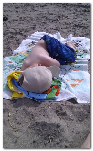 Litt mye frisk luft gjorde at han sovnet på stranda. Solfaktor 50 gjorde at han ikke ble solbrent.