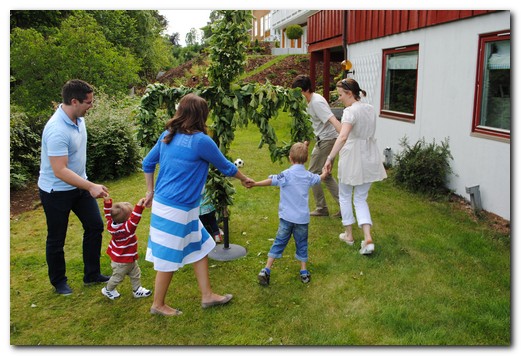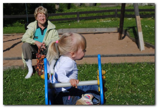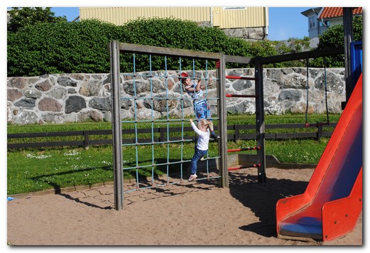Lekeplassen som ligger like ved huset er kjekk å ha når barna trenger å brenne unna noen kalorier. Emeli viser her fram sin hestehale som nå endelig får være i fred mer enn noen minutter. Inga passer på.