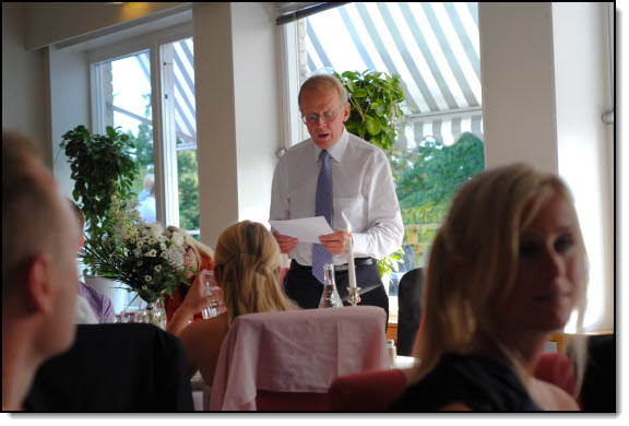 Festen ble også meget bra, med taler og lykkeønskninger fra nær og fjern. Her er brudens far i aksjon.