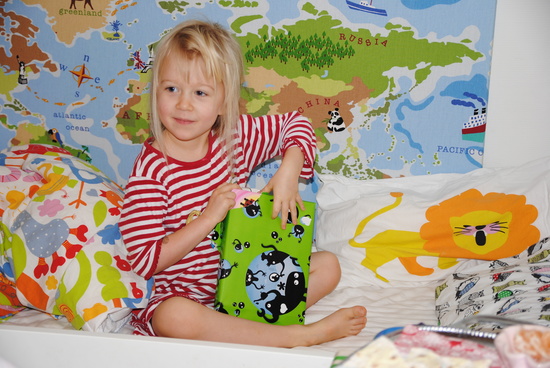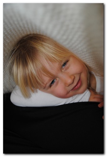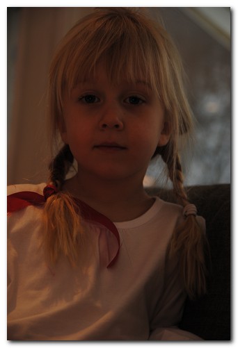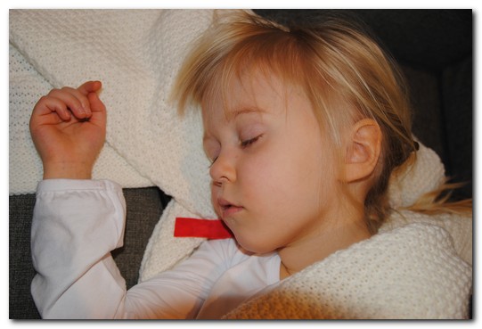 Etter å ha vært klengete en stund tok hun på eget initiativ å las seg på sofaen med teppet over seg og sovnet.
