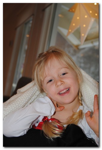 Ingen tvil om at det er samme sykdommen som resten av familien har hatt. Etter hvert pignet hun til men hun har fått holde seg inne i helgen. Ute er det sludd og regn så det er uansett ikke noe vær å være ute i.
