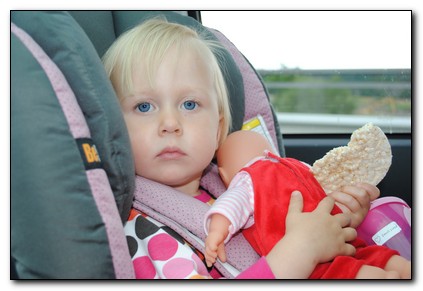 En tålmodig Emeli i sin nya bilstol. Det blev många mil i bil under semestern.