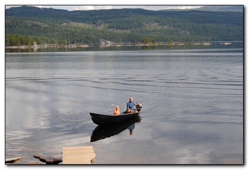 I helgen tok vi en tur til hytta til Ella og Ingvar, min tante og onkel. Hytta ligger ved Follsjø og vi hadde knapt kommet over ved Blefjell før en kunne kjenne vaffellukta. Follsjø ligger ikke lenger unna enn ca. 1 time og 45 minutter fra Oslo, 3 mil vest for Kongsberg. Vi ble møtt av Ingvar som tok oss over sjøen i båt, noe Sindre syns var stor stas.