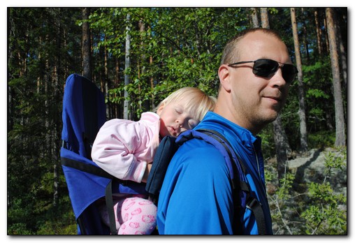 På Søndag tok vi en liten gåtur hvor Emeli ble plassert i bæremeis. Vuggende gange gjennom skogen gjorde at hun sovnet, to timer før den vanlige sovetiden midt på dagen.