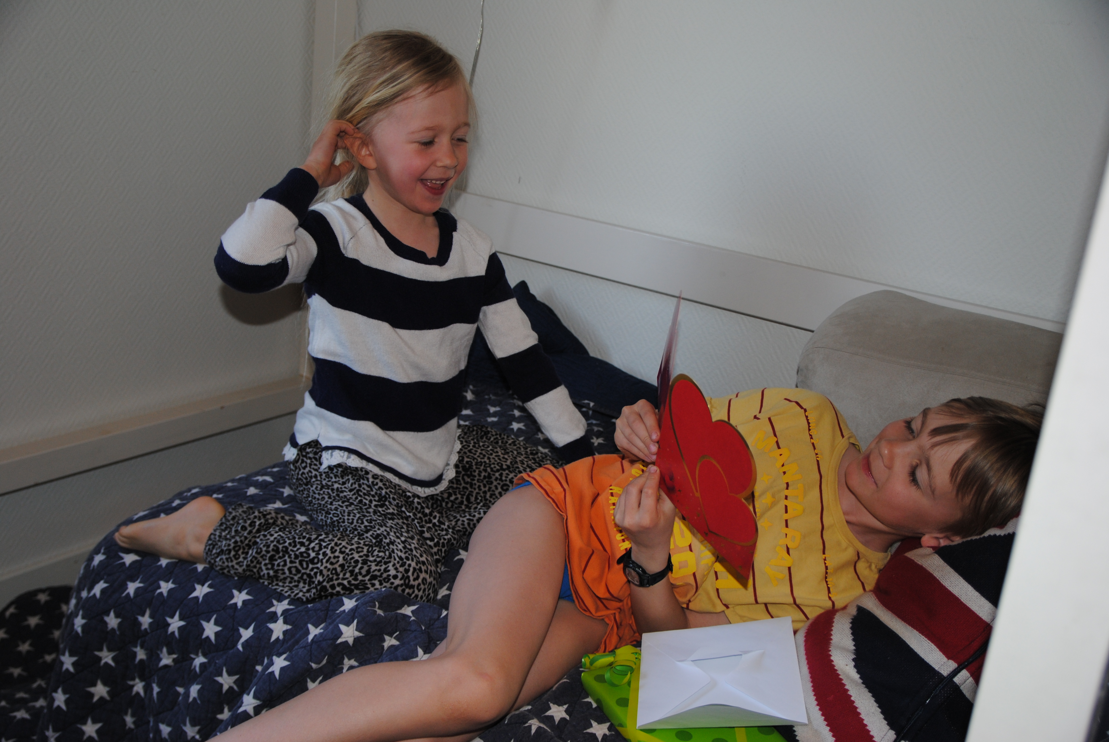 Sindre hadde 9 års dag på Torsdag 24 April, og den ble som vanlig startet med frokost og gaver på senga. Sindre har jo køyeseng så de fikk bli i sofaen i stedet.