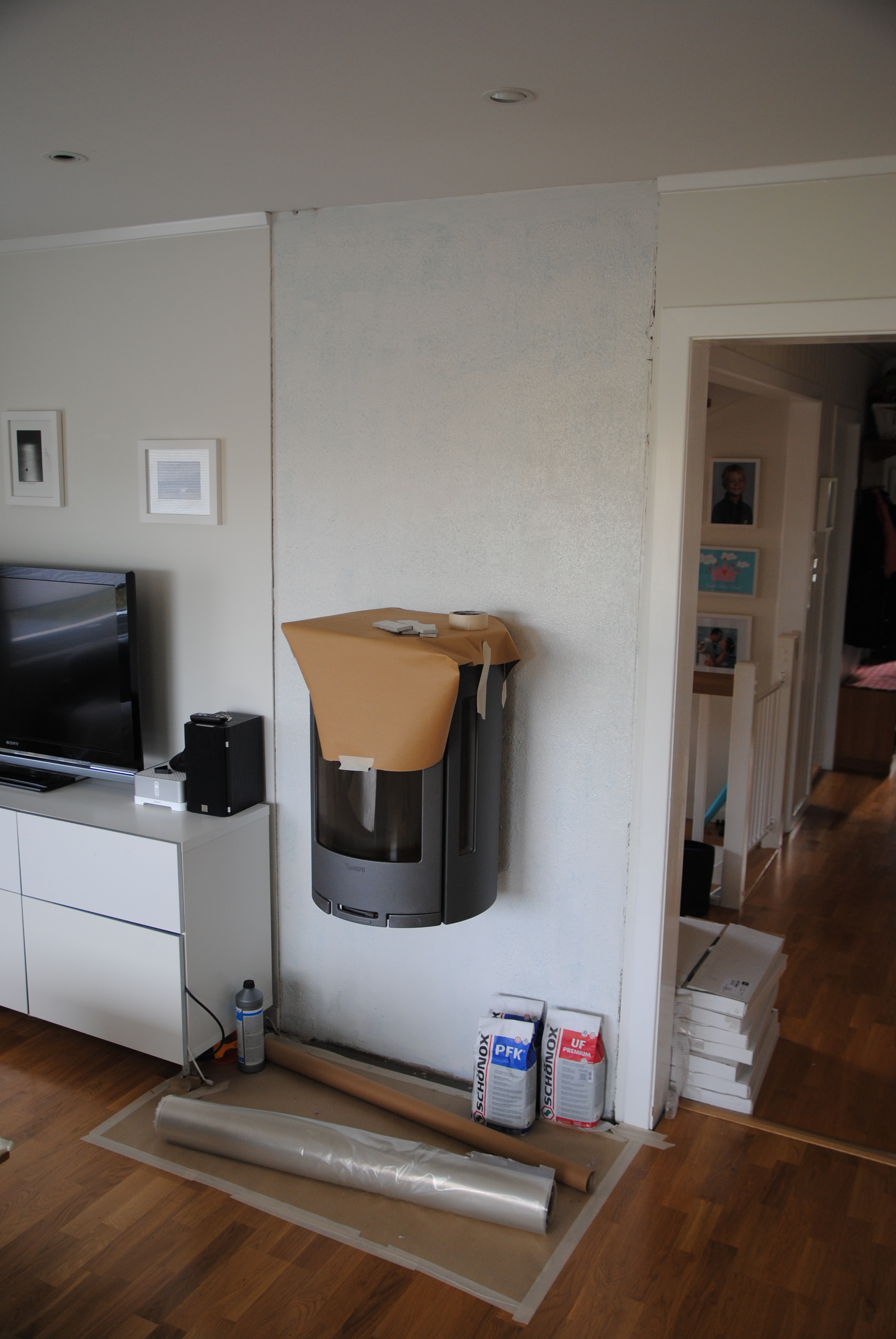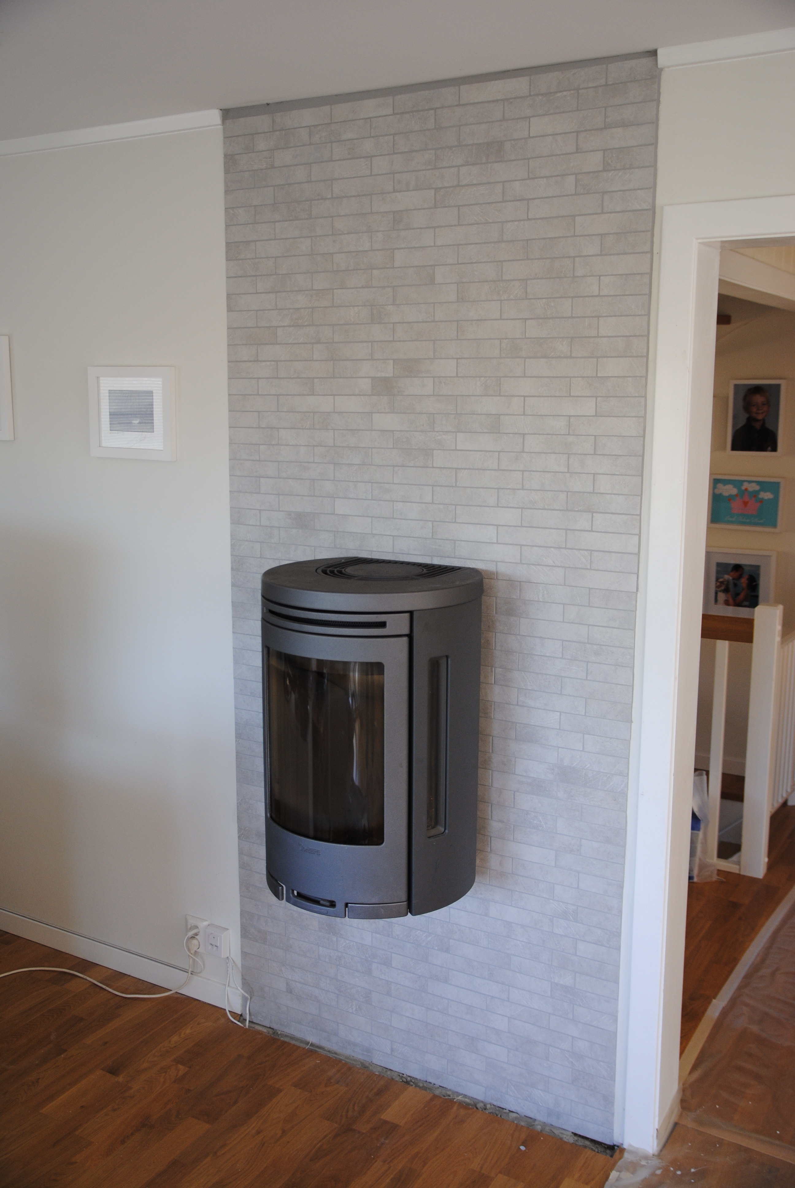 Ellers har vi endelig fått satt opp fliser på brannveggen i stua, vår nabo Mariusz var snill nok til å hjelpe oss over helgen med det. Resultatet ble veldig bra.