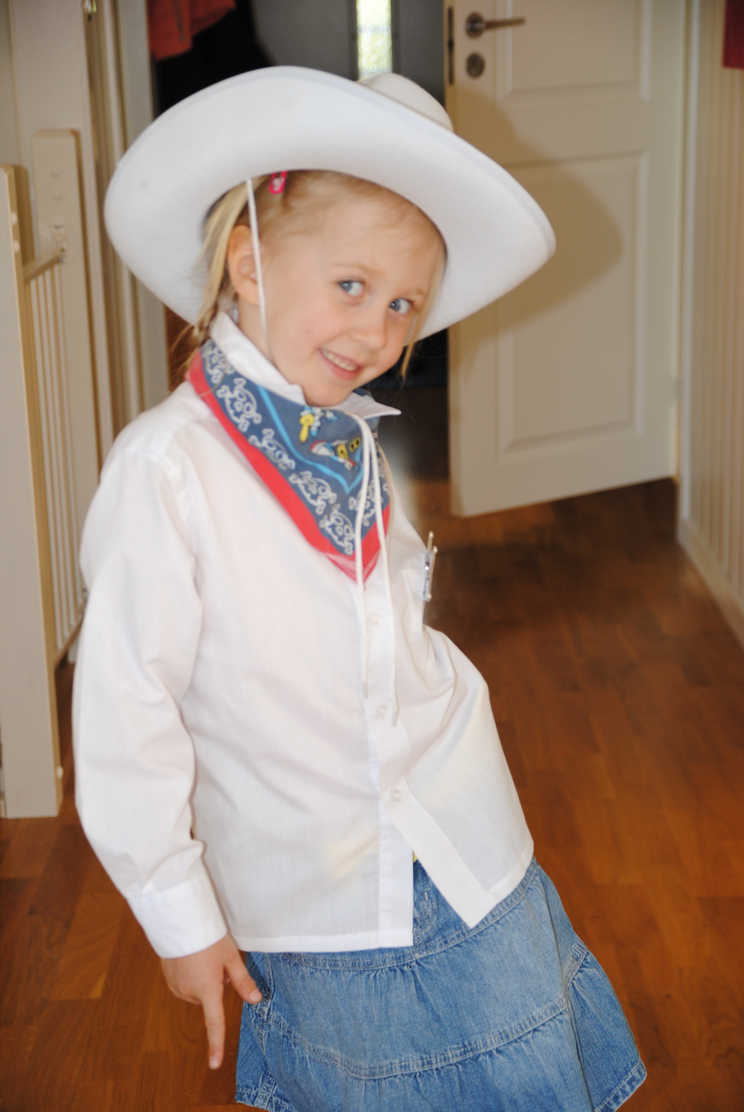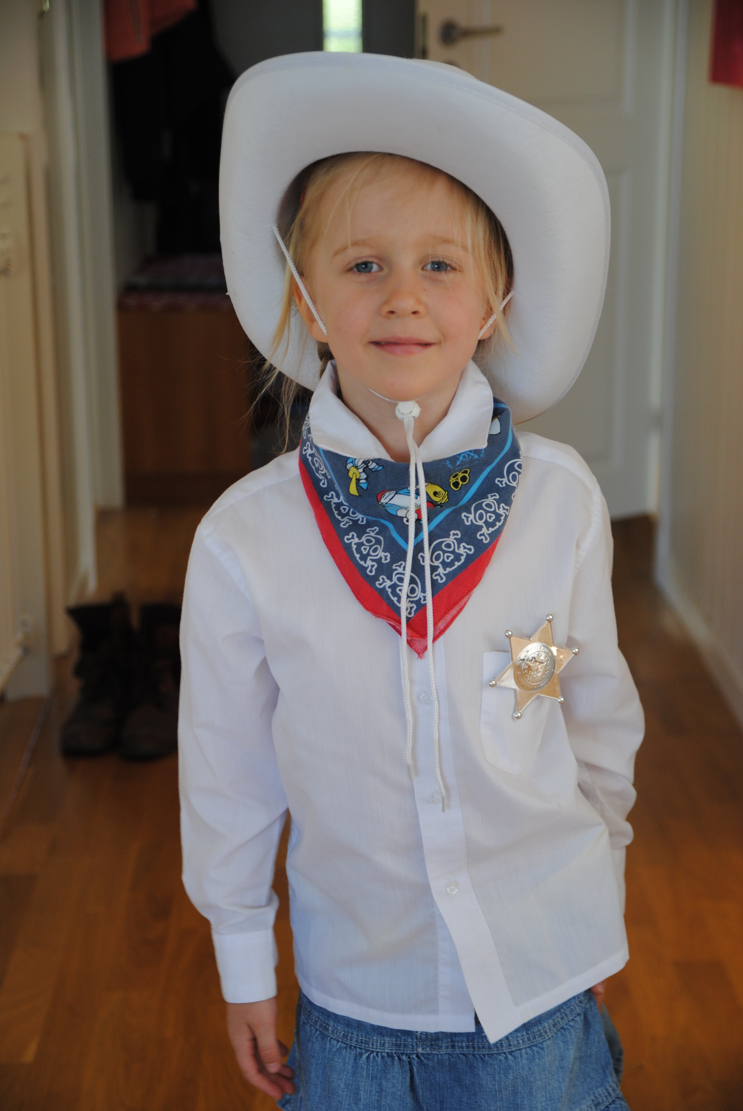 Det var Cowboy og indianertema på festen og gutta var ikke vonde å be på lek med kruttlapppistoler og pil og bue. Jentene var de som var flinkest til å kle seg med DEmeli mest gjennomført av alle.